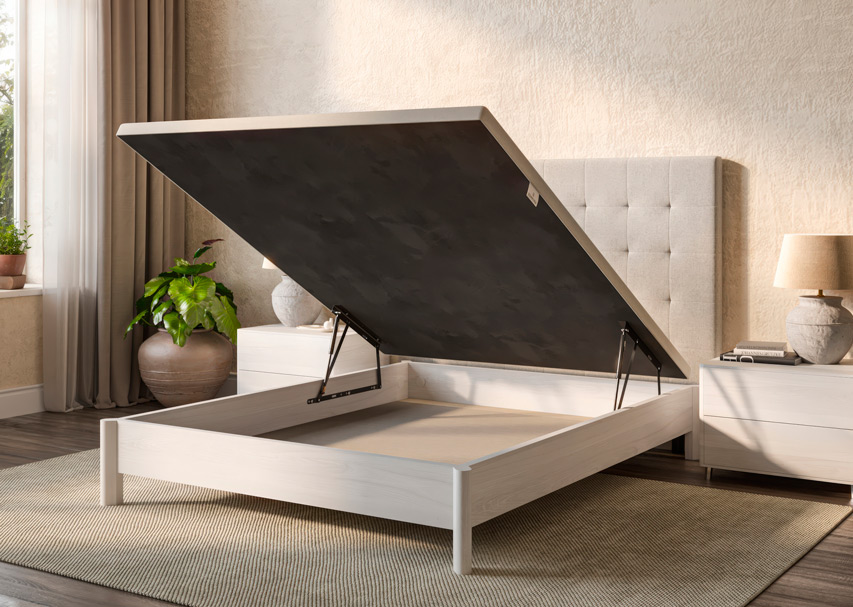 El canapé abatible Level de Sonpura presenta un diseño diferente, con patas esquineras de madera maciza sobre las que descansa la tapa voladiza elevada, con perímetro tapizado y parte central con tejido 3D antideslizante. Estructura con acabado de madera de 3 cm. La altura total es de 36 cm. y el hueco interior útil de 17 cm. Disponible en 5 acabados de madera.
